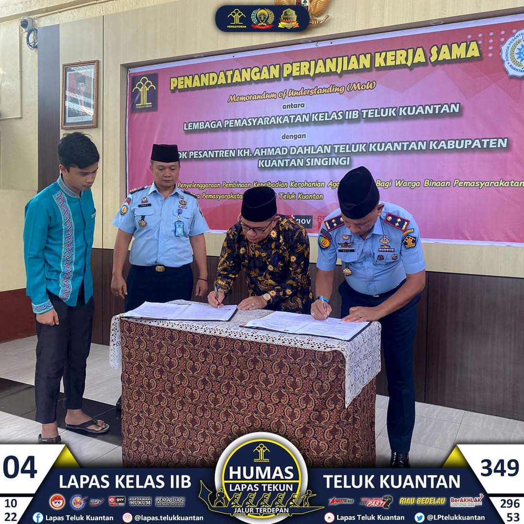Kuansing- Bertempat di ruang aula (serbaguna) Kegiatan Penandatangan Perjanjian Kerjasama Antara Lapas Teluk Kuantan dengan Ponpes KH. Ahmad Dahlan dilaksanakan. Kegiatan dimulai dengan pembacaan Ayat Suci AL-Quran oleh santri Lapas Teluk Kuantan, Selasa (04/10/2022).