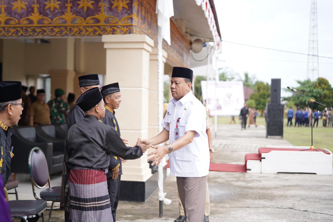 PLT Bupati Kuansing Suhardiman Amby Bersalaman Dengan Tokoh Masyarakat Kecamatan Benai Saat Upacara Dalam Rangka Hari Anti Korupsi Sedunia.