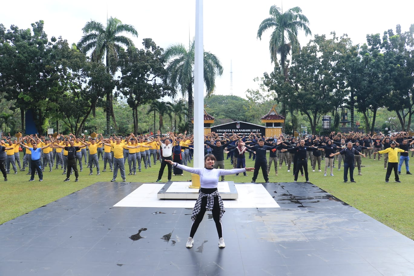 PEKANBARU - Pemerintah Kota (Pemko) Pekanbaru menggelar senam bersama unsur Forkopimda Pekanbaru termasuk TNI dan Polri di halaman Mal Pelayanan Publik (MPP), Jumat (10/2). Senam bersama ini dalam rangka memeriahkan HUT ke-73 Satuan Polisi Pamong Praja (Satpol PP) dan Satlinmas ke-61 setiap 3 Maret.