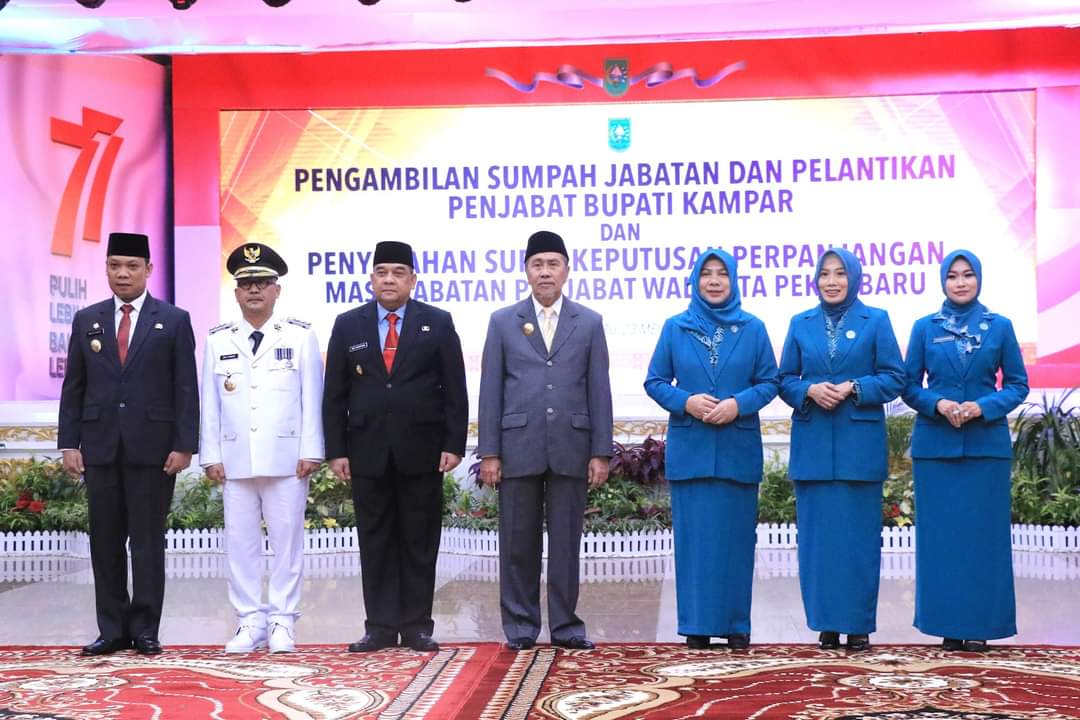 PEKANBARU - Gubernur Riau (Gubri) Syamsuar Msi, menyerahkan surat keputusan perpanjangan masa jabatan sebagai Penjabat (Pj) Wali Kota Pekanbaru kepada Muflihun SSTP MAP.