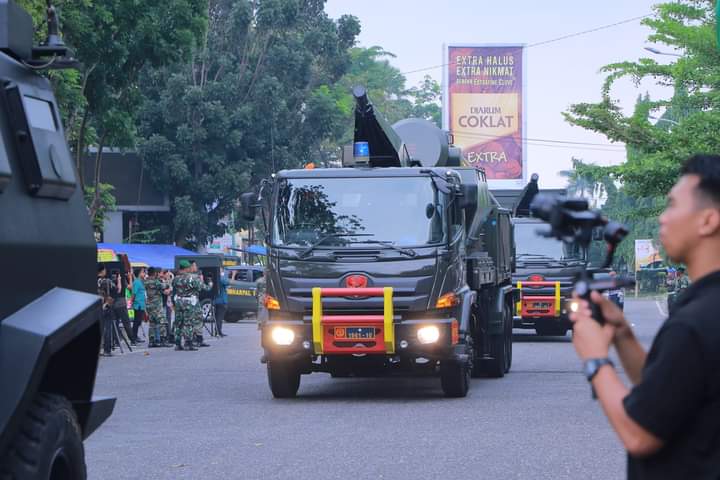 PEKANBARU - Penjabat (Pj) Wali Kota Pekanbaru Muflihun menyaksikan parade dan defile pasukan TNI dan Polri di area kantor gubernur Riau, Kamis (5/10/2023). Parade dan Defile ini kembali digelar setelah pandemi Covid-19.