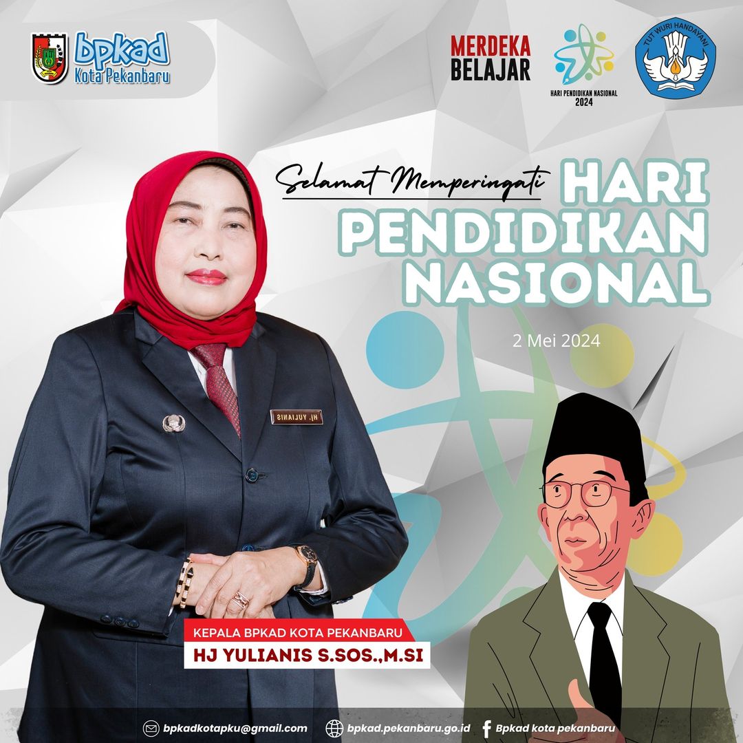PEKANBARU - Dalam momentum peringatan Hari Pendidikan Nasional, Kepala Badan Pengelolaan Keuangan dan Aset Daerah (BPKAD) Kota Pekanbaru, Hj Yulianis S.Sos., M.Si, mengirimkan ucapan selamat kepada seluruh insan pendidikan di Indonesia. Dalam ucapan yang disampaikannya, beliau mengajak untuk terus bergotong royong dalam menyemarakkan dan melanjutkan Gerakan Merdeka Belajar.