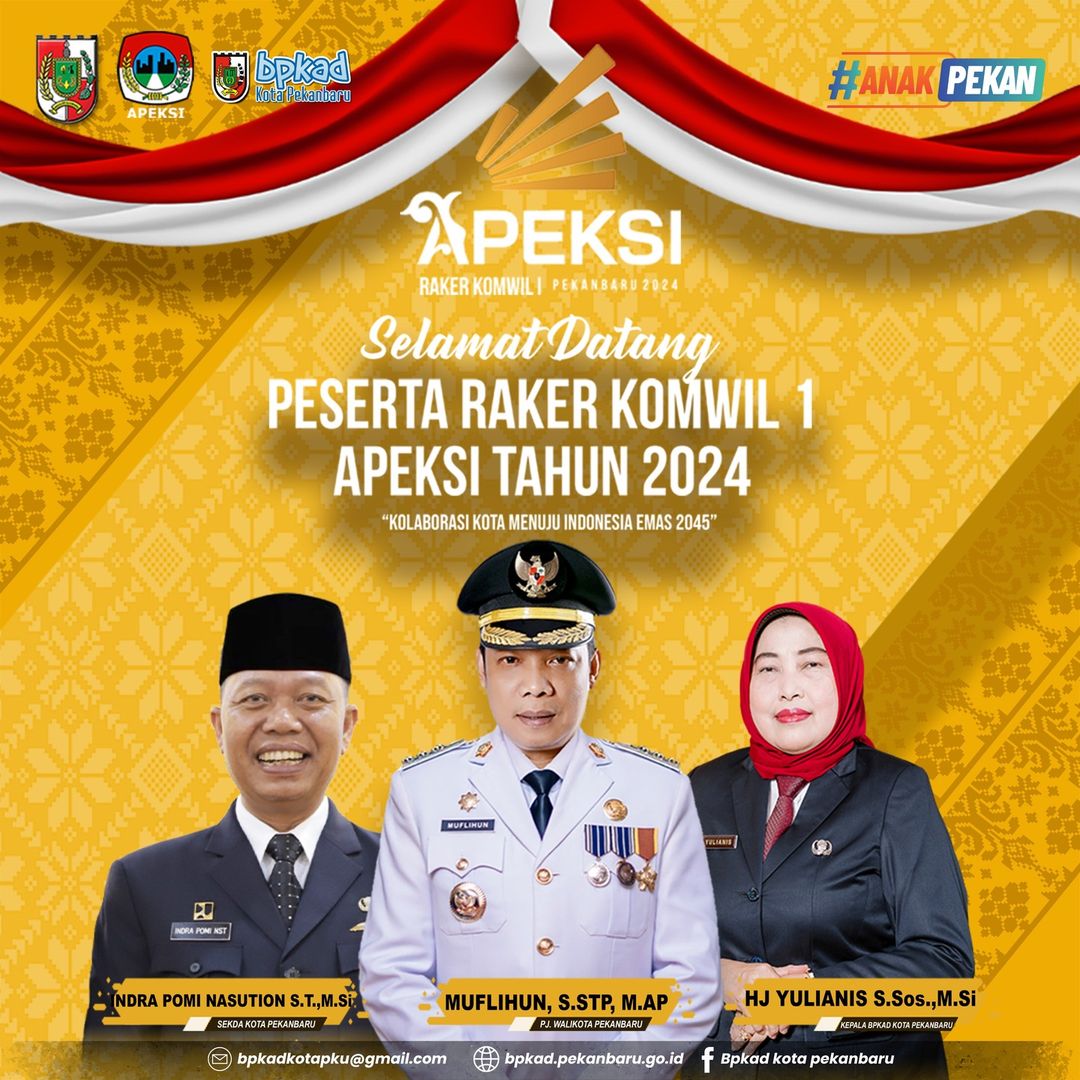 Acara APEKSI yang berlangsung di Kota Pekanbaru pada tanggal 01 - 05 Mei 2024 ini bertajuk "Kolaborasi Kota Menuju Indonesia Emas 2045". Raker Komwil 1 APEKSI menjadi momentum penting dalam membangun sinergi dan kerja sama antar pemerintah kota di wilayah komwil 1, untuk mencapai visi Indonesia sebagai negara emas pada tahun 2045.