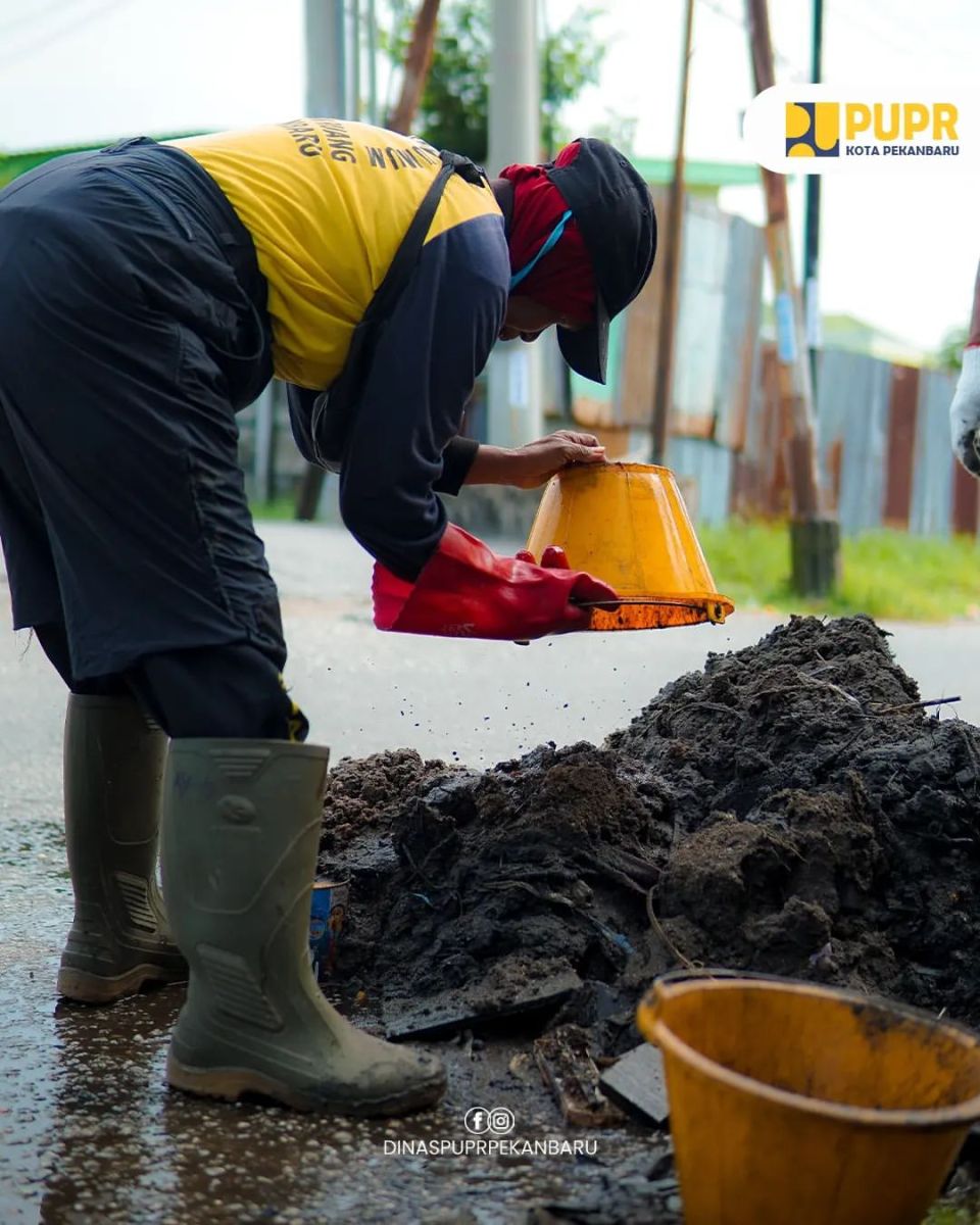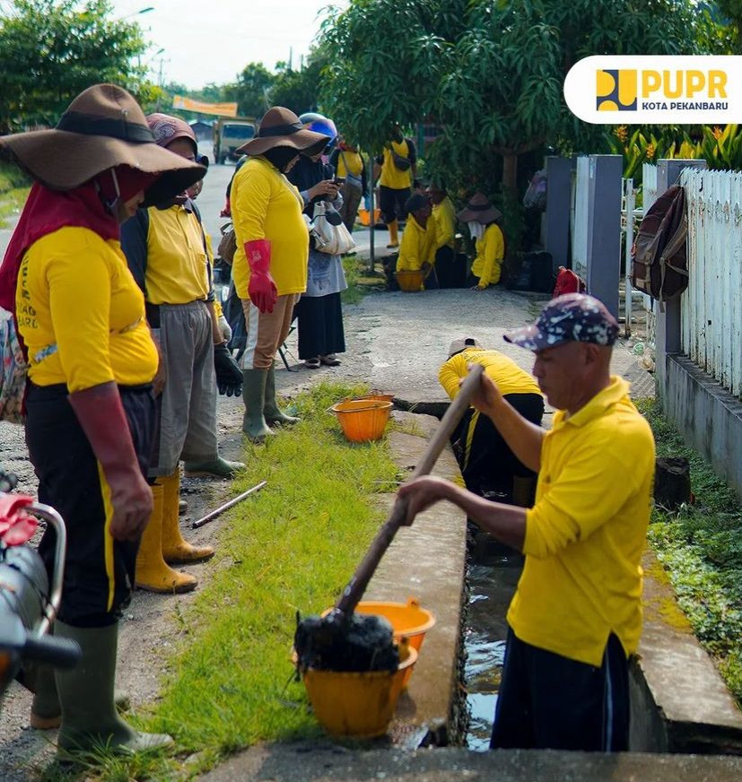 PEKANBARU - Dinas Pekerjaan Umum dan Penataan Ruang (PUPR) Kota Pekanbaru melakukan pembersihan saluran drainase di Jalan Merak dan di Jalan Soebrantas, Jumat, (31/5/2024).