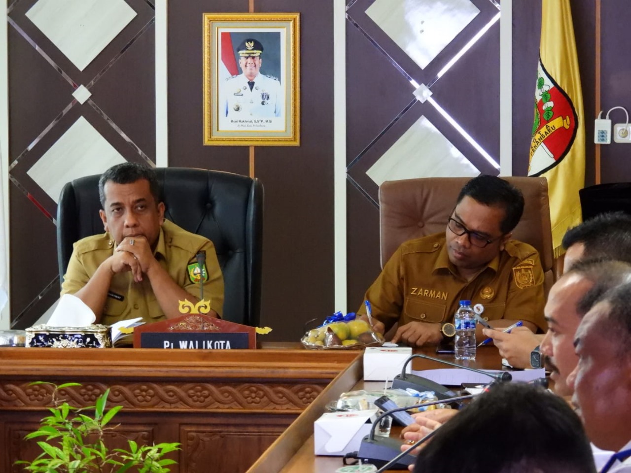 PEKANBARU - Penjabat (Pj) Wali Kota Pekanbaru, Roni Rakhmat, S.STP., M.Si., memimpin rapat penataan Pedagang Kaki Lima (PKL) di area Car Free Day (CFD) Jalan Ahmad Yani, Pasar Selasa, serta persiapan operasionalisasi Taman Labuai City Walk. Rapat berlangsung di Ruang Rapat Wali Kota, Lantai 5, Komplek Perkantoran Tenayan Raya. pada Senin (6/1/2025).